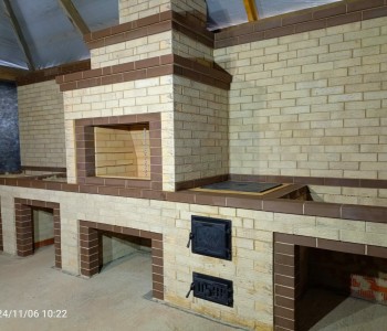 Включает в себя русскую печь, мангал, место под казан, а также рабочую зону для готовки.